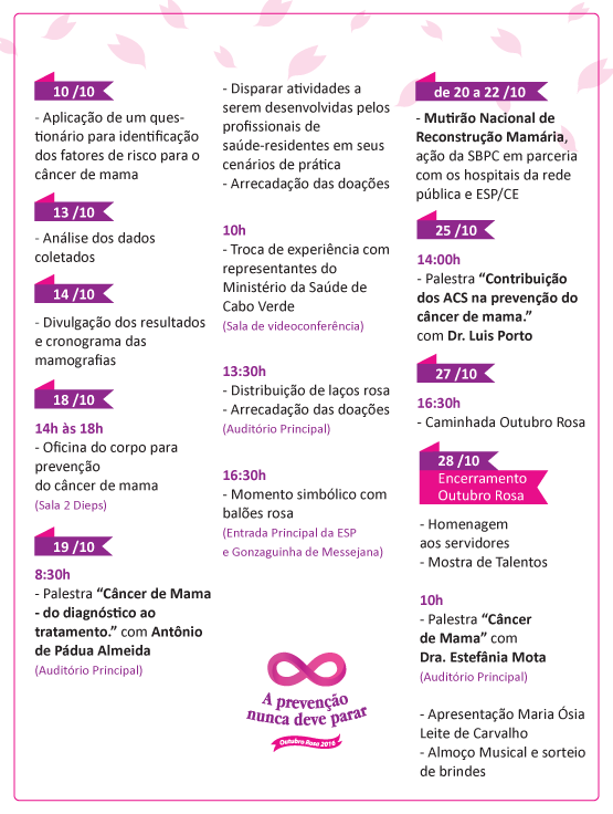 A Escola de Saúde Pública do Ceará (ESP/CE) abraça a causa rosa e promove, neste mês, várias ações para reforçar a importância da prevenção e do diagnóstico precoce do câncer de mama. Palestras, oficina, arrecadação de doações, entre outras atividades, mobilizarão os servidores da ESP/CE no sentido de conscientizá-los sobre o movimento Outubro Rosa.