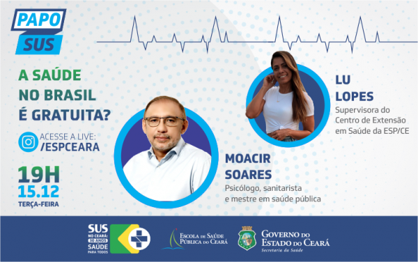A saúde no Brasil é gratuita? Estas pergunta será o ponto de partida da próxima edição do Papo SUS, série de lives promovida pela Escola de Saúde Pública do Ceará (ESP/CE), vinculada à Secretaria da Saúde do Estado (Sesa), com o objetivo de discutir os serviços e desafios do Sistema Único de Saúde (SUS). A transmissão ao vivo ocorre nesta terça-feira, 15, a partir de 19h, pelo perfil no Instagram @espceara.